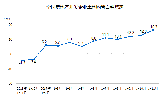 1-11月份,房地產(chǎn)開發(fā)企業(yè)土地購置面積22158萬平方米,同比增長16.3%,增速比1-10月份提高3.4個(gè)百分點(diǎn);土地成交價(jià)款11436億元,增長47.0%,增速提高3.7個(gè)百分點(diǎn)。