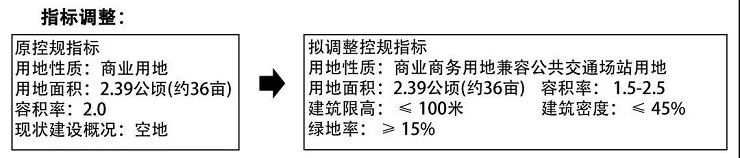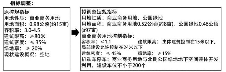 用地調(diào)整:落實專項規(guī)劃,補充和完善周邊停車需求和綠地空間,統(tǒng)籌地上地下空間開發(fā),充分挖潛、高效利用土地資源,將地塊從一塊商業(yè)商務(wù)用地調(diào)整為一塊公園綠地和一塊商業(yè)商務(wù)用地。