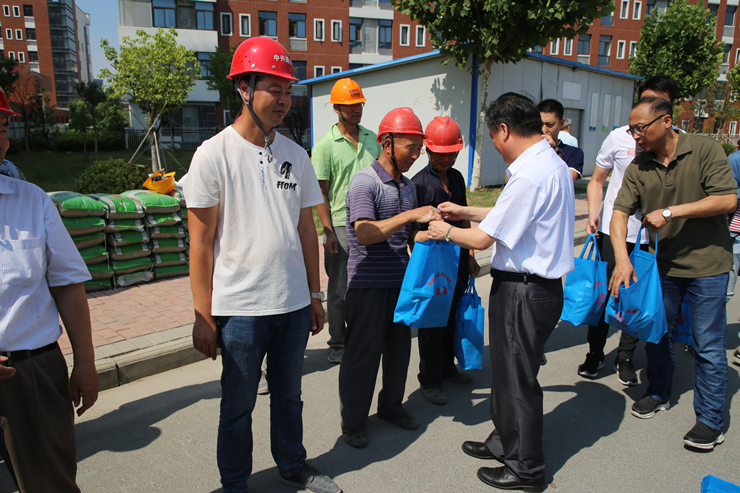 鄭主席一行為工人們發(fā)放了夏季防暑降溫物資,并對(duì)為了高校建設(shè),冒著酷暑仍然奮戰(zhàn)在工地上的工人們表示親切的慰問(wèn),叮囑大家把健康、安全放在第一位,根據(jù)實(shí)際情況調(diào)整好作息時(shí)間,避開(kāi)高溫時(shí)間段施工,提高安全意識(shí),確保文明施工,安全施工。