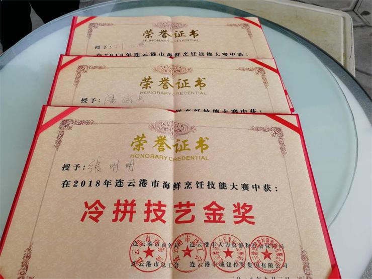 在本次比賽中,花果山酒店王蘇偉、曹光明、姚龍武獲得烹飪能手金獎,朱慶鵬獲得冷拼技藝金獎,謝建麗獲得中式面點金獎。海州灣會議中心張明明獲得個人組冷拼技藝金獎,劉小燕獲得中式面點金獎,潘海彬獲得烹飪能手金獎。蔚藍海岸國際大酒店顧澤惠獲得中式面點金獎,孫浩杰獲得冷拼技藝銀獎。三家團隊所制作的海鮮宴獲得了評委會的一致肯定,均被授予“海鮮名宴”稱號。