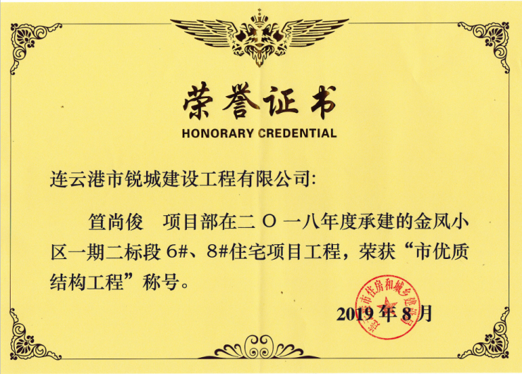 近日從連云港市住房和城鄉(xiāng)建設(shè)局傳來喜訊,由建工集團(tuán)承建的金鳳小區(qū)一期工程(6#住宅、 8#住宅)榮獲“市優(yōu)質(zhì)結(jié)構(gòu)工程”稱號。