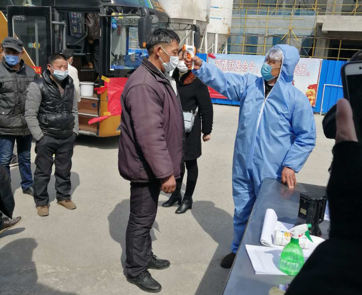 潤科集團嚴格落實防控舉措,外防輸入、內(nèi)防擴散,堅持按照項目計劃提前籌備施工人員返崗工作,提前與施工方溝通協(xié)調(diào),提早謀劃防疫防控、施工組織,及時制定工程分點復工、人員分批返崗等措施,最終通過“包車”方式,將首批返崗人員及時安全送到項目現(xiàn)場。到達項目現(xiàn)場后,工作人員依次進行行李消毒、體溫檢測、個人信息登記等,返崗人員有序接受檢查。
