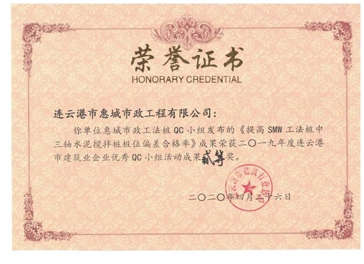 近日,從連云港市建筑業(yè)協(xié)會(huì)傳來喜訊,建工集團(tuán)惠城市政通過前期充分準(zhǔn)備,參評(píng)的3項(xiàng)活動(dòng)成果均榮獲獎(jiǎng)項(xiàng)。由公司技術(shù)骨干邱楊發(fā)布的《提高SMW工法樁中三軸水泥攪拌樁樁位偏差合格率》、晏翰林發(fā)布的《提高蒸汽管道拼接焊縫外觀質(zhì)量》均獲得二等獎(jiǎng),陳厚全發(fā)布的《提高橋梁橡膠支座安裝合格率》榮獲三等獎(jiǎng) 。