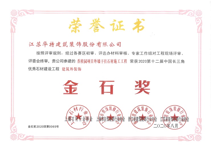 2020年3月份,同城地產權屬公司嘉富城積極組織江蘇華特建筑裝飾股份有限公司,以香桂園項目外墻干掛石材施工工程參加中國長三角優(yōu)秀石材建設工程金石獎評選活動。經(jīng)過行業(yè)推薦、各級評審,香桂園項目外墻干掛石材施工工程最終以精湛的施工工藝和高標準的施工質量,榮獲2020第十二屆中國長三角優(yōu)秀石材建設工程建筑外裝飾金石獎。