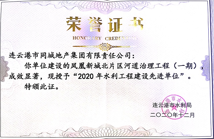 近日,從連云港市水利局傳來(lái)喜訊,同城地產(chǎn)投資建設(shè)的鳳凰新城北片區(qū)河道治理工程(一期)榮獲“2020年水利工程建設(shè)先進(jìn)單位”。